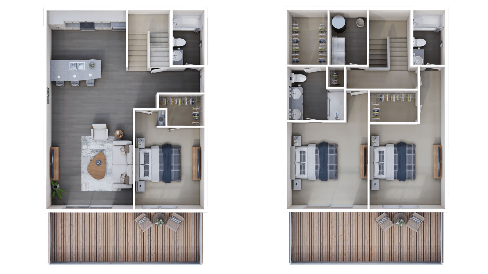 Would you and your family or friends like to live in a 3-bedroom townhouse in a thriving community? If so, we’d like to introduce The Marley. The Marley is a 3-bedroom, 3-bathroom, 1,588-square-foot townhouse at VC Park at Geauga Lake. We’re in Aurora, Ohio, located halfway between Akron and Cleveland. A bit of history about our community is that we’re on the premises of a former amusement park. The Marley is fully loaded with modern conveniences and first-class amenities. The main living area has an open floor plan, and the kitchen is outfitted with energy-efficient stainless-steel appliances, a work island with a double sink, extra seating, and granite countertops. You’ll love having a full-sized washer and dryer on the second floor. One bedroom and one full bathroom are on the first floor, and the other two bedrooms and bathrooms are on the second floor. Each bedroom has a walk-in closet, and there are full balconies on each level.